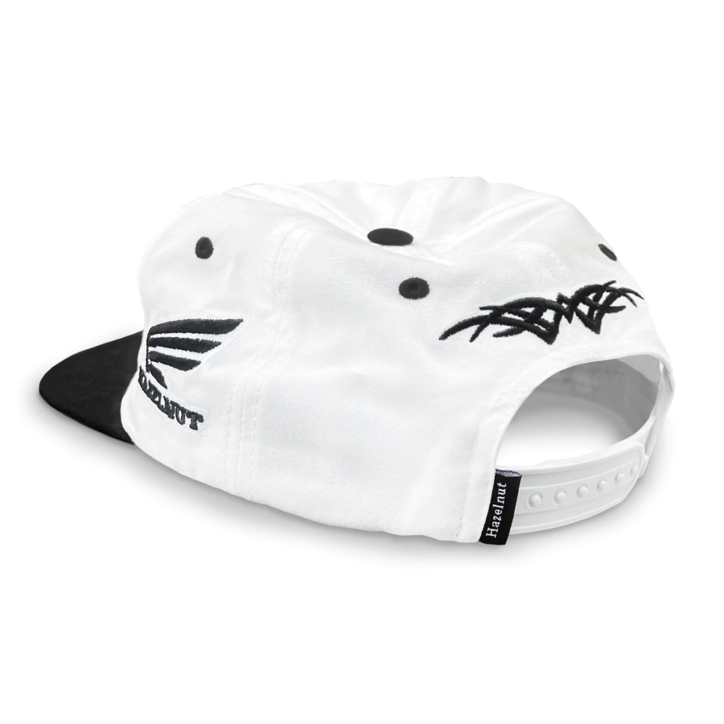 Boné bordado, desestruturado, aba rígida e de forma rasa.